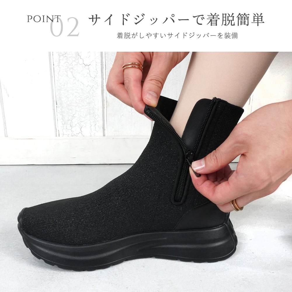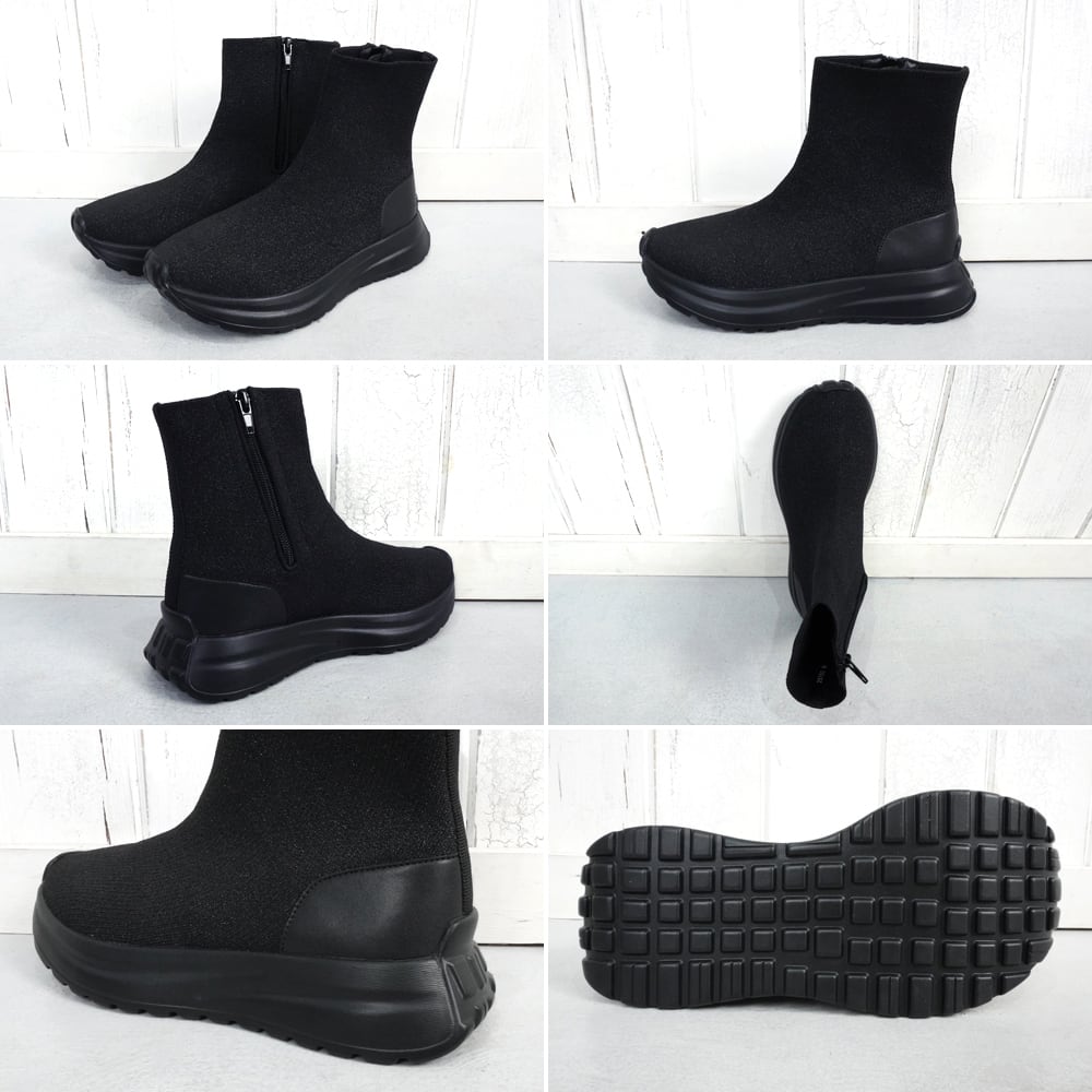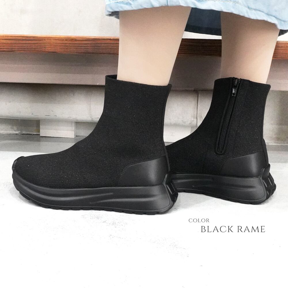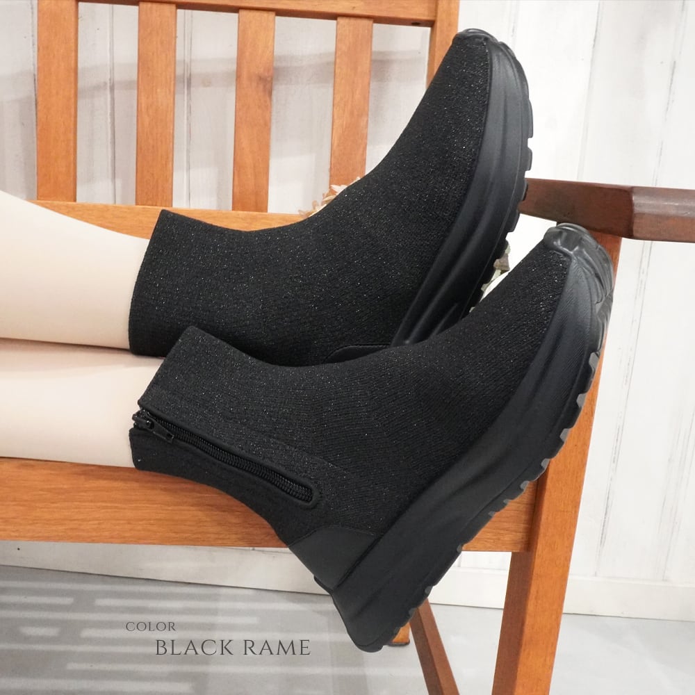 【ニットストレッチ素材】レディース スニーカーブーツ ショート スニーカーソックス 4cm 厚底 軽量 サイドジップ 履きやすい 歩きやすい 疲れにくい ヒールなし おしゃれ 黒 ブラック キラキラ ラメ | mamago| がんばるママの味方