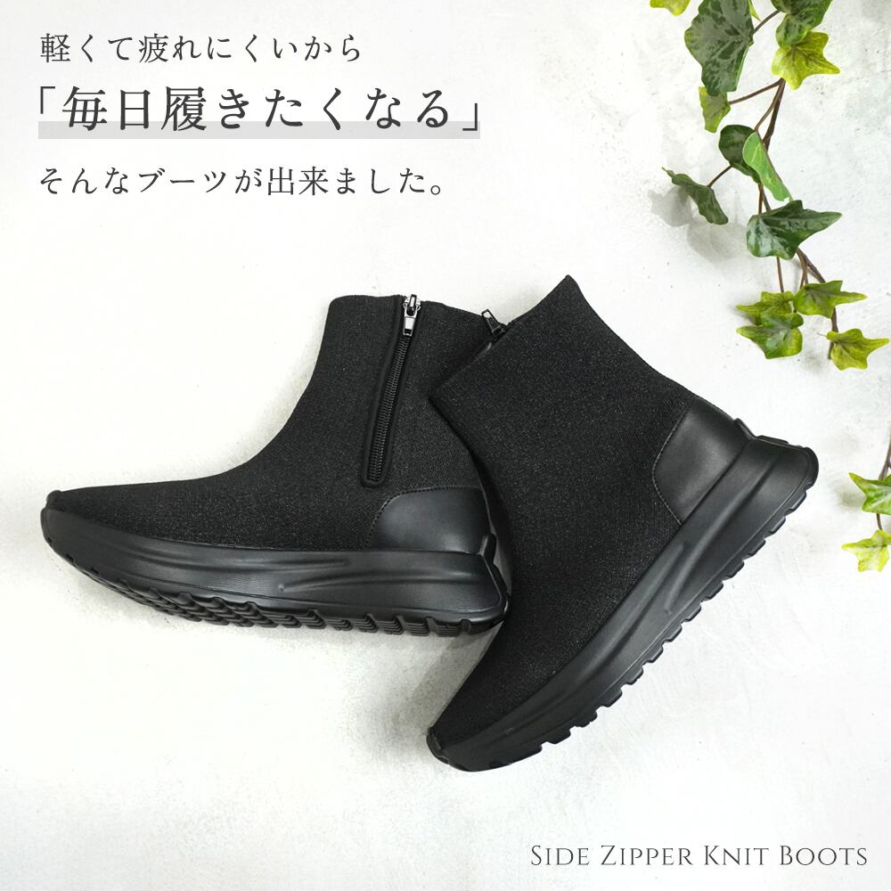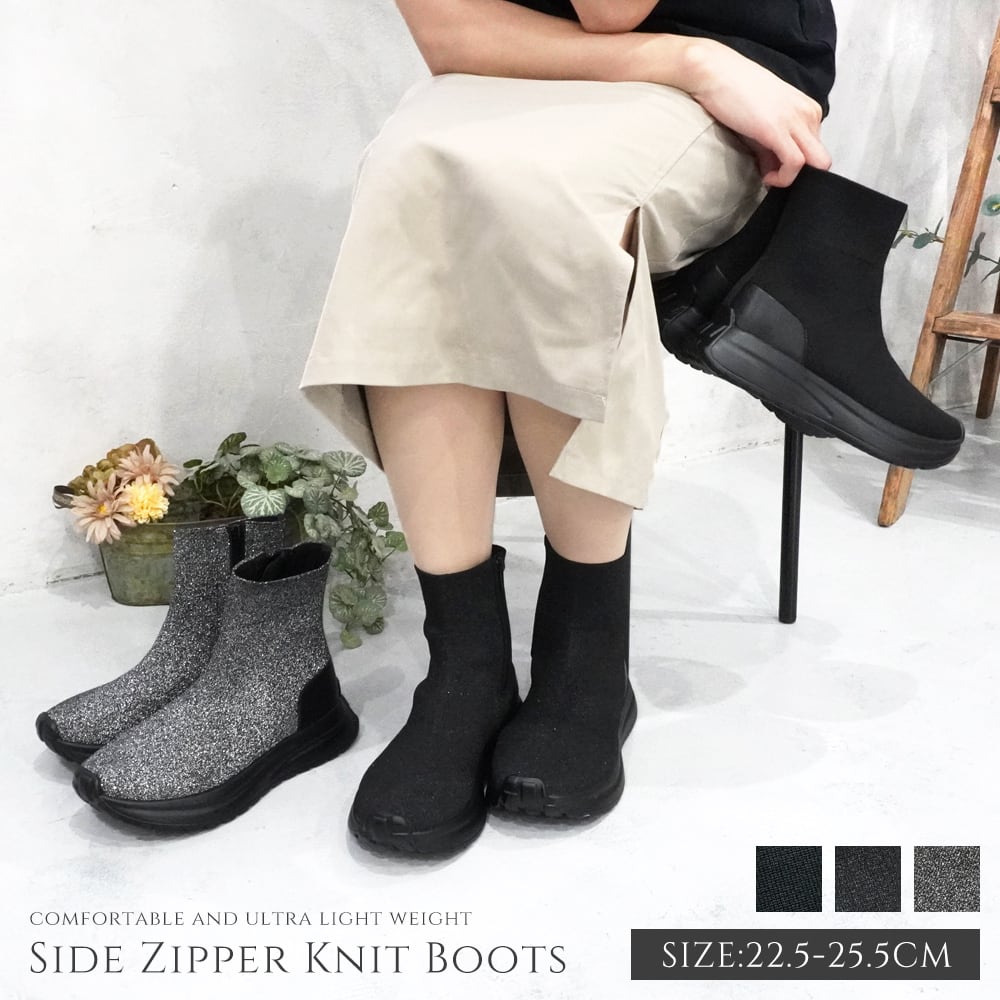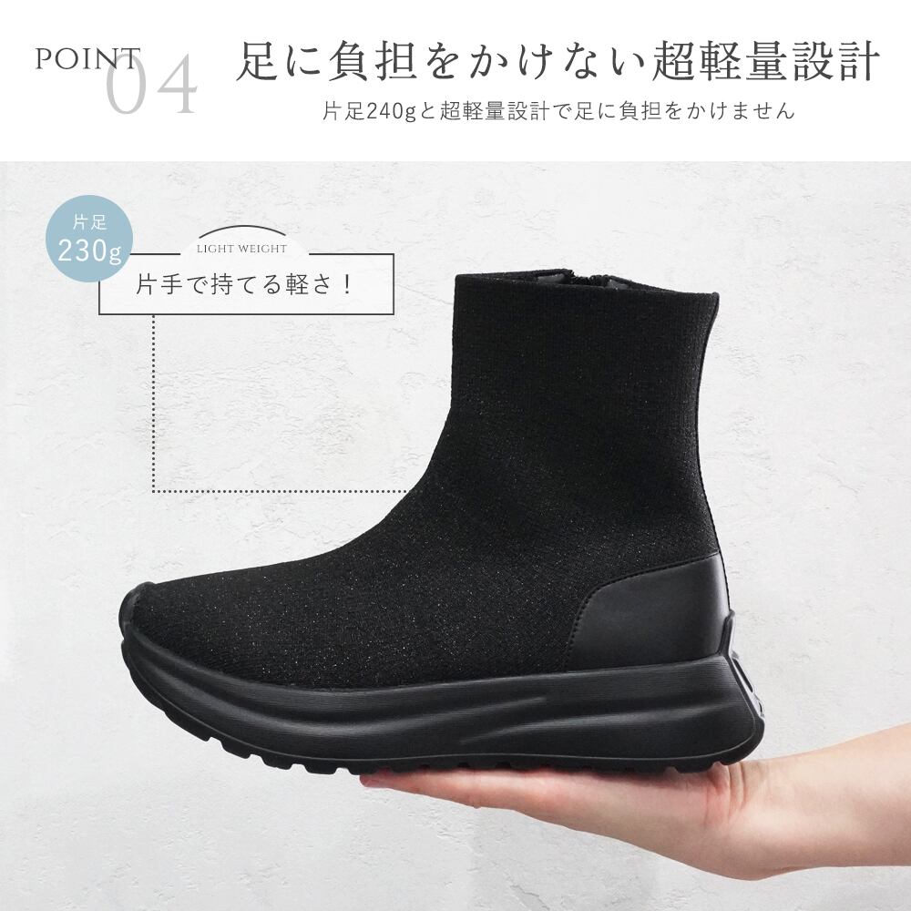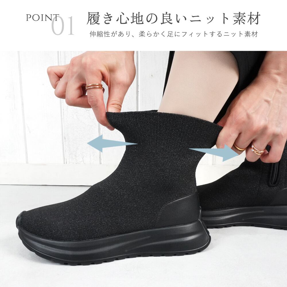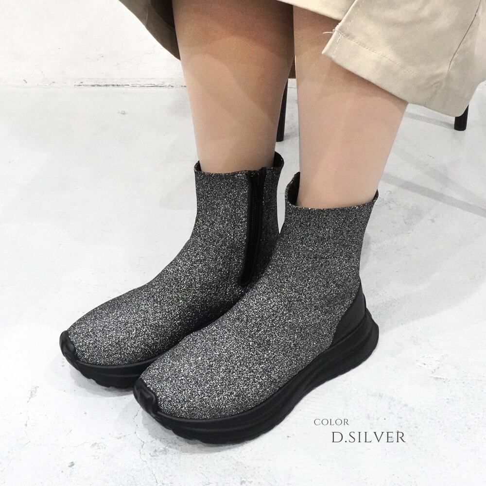 【ニットストレッチ素材】レディース スニーカーブーツ ショート スニーカーソックス 4cm 厚底 軽量 サイドジップ 履きやすい 歩きやすい 疲れにくい ヒールなし おしゃれ 黒 ブラック キラキラ ラメ | mamago| がんばるママの味方